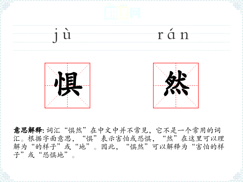 由于“惧然”不是一个常用词汇,它在文学、口语或专业领域中的使用非常有限。可能在一些古文或特定文学作品中出现,用以描述人物的情感状态。