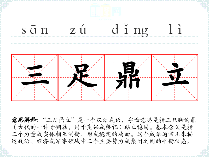“三足鼎立”是一个汉语成语,字面意思是指三只脚的鼎(古代的一种青铜器,用于烹饪或祭祀)站立稳固。基本含义是指三个力量或实体相互制衡,形成稳定的局面。这个成语通常用来描述政治、经济或军事领域中三个主要势力或集团之间的平衡状态。