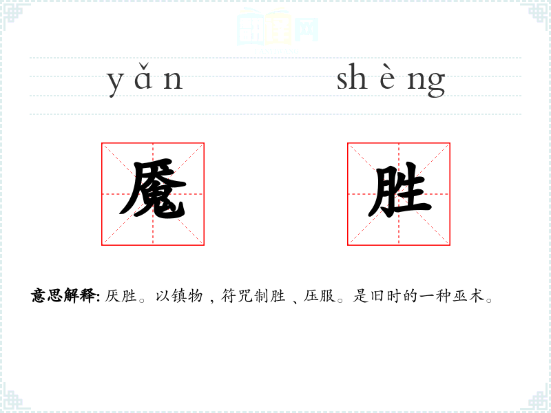 厌胜。以镇物﹐符咒制胜﹑压服。是旧时的一种巫术。