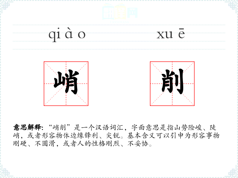 “峭削”是一个汉语词汇,字面意思是指山势险峻、陡峭,或者形容物体边缘锋利、尖锐。基本含义可以引申为形容事物刚硬、不圆滑,或者人的性格刚烈、不妥协。