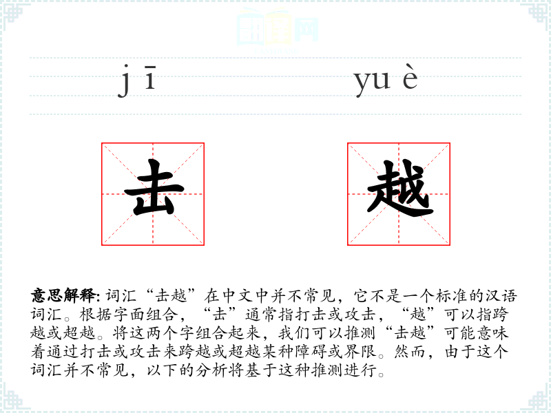 词汇“击越”在中文中并不常见,它不是一个标准的汉语词汇。根据字面组合,“击”通常指打击或攻击,“越”可以指跨越或超越。将这两个字组合起来,我们可以推测“击越”可能意味着通过打击或攻击来跨越或超越某种障碍或界限。然而,由于这个词汇并不常见,以下的分析将基于这种推测进行。