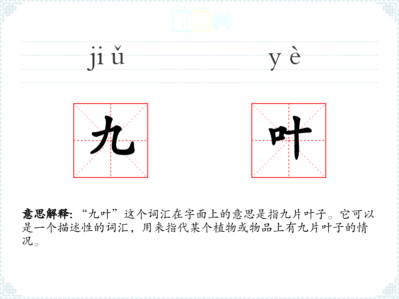 “九叶”这个词汇在字面上的意思是指九片叶子。它可以是一个描述性的词汇,用来指代某个植物或物品上有九片叶子的情况。