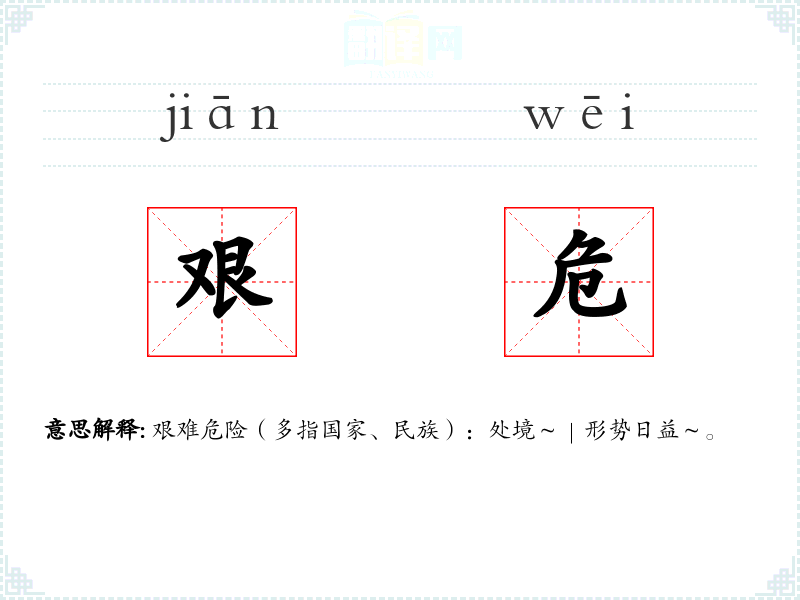 艰难危险(多指国家、民族):处境~|形势日益~。