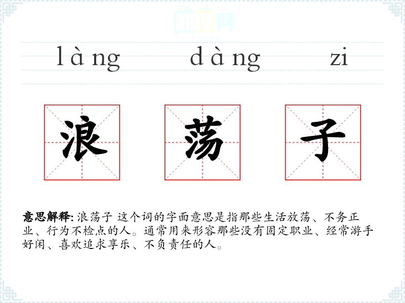 浪荡子 这个词的字面意思是指那些生活放荡、不务正业、行为不检点的人。通常用来形容那些没有固定职业、经常游手好闲、喜欢追求享乐、不负责任的人。