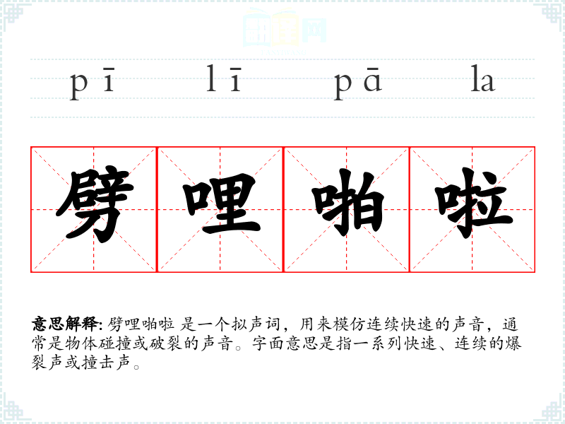 劈哩啪啦 是一个拟声词,用来模仿连续快速的声音,通常是物体碰撞或破裂的声音。字面意思是指一系列快速、连续的爆裂声或撞击声。