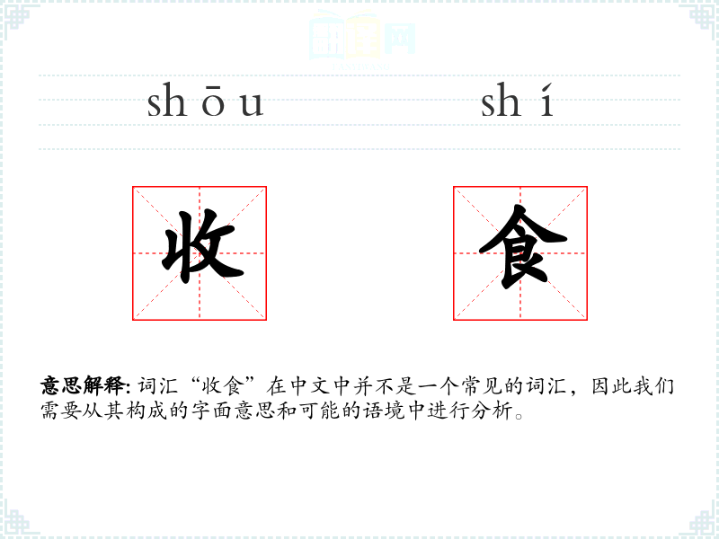 词汇“收食”在中文中并不是一个常见的词汇,因此我们需要从其构成的字面意思和可能的语境中进行分析。