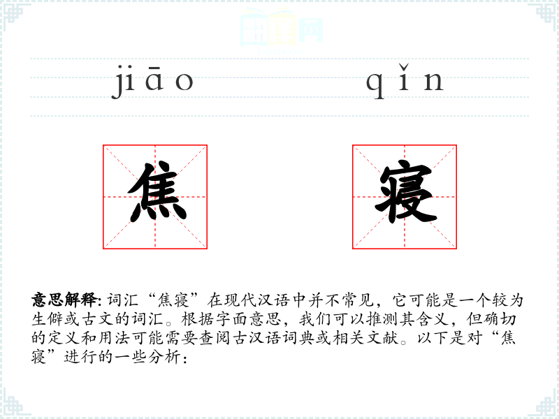 词汇“焦寝”在现代汉语中并不常见,它可能是一个较为生僻或古文的词汇。根据字面意思,我们可以推测其含义,但确切的定义和用法可能需要查阅古汉语词典或相关文献。以下是对“焦寝”进行的一些分析: