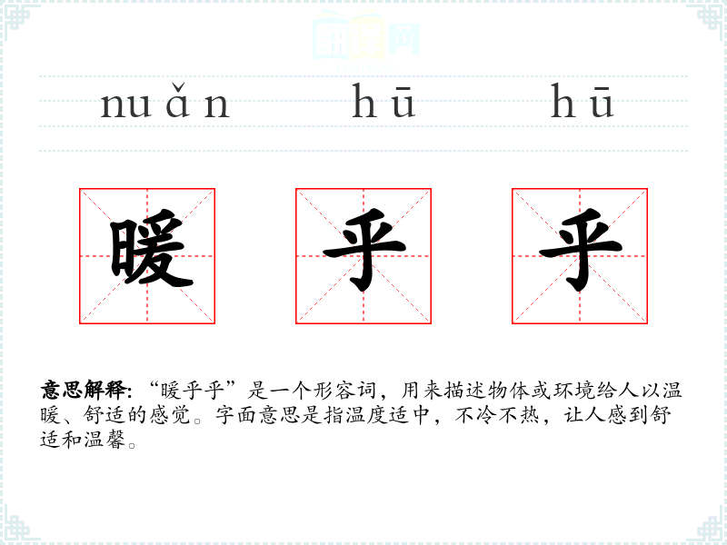 “暖乎乎”是由“暖”和“乎乎”两个部分组成。其中,“暖”字古已有之,表示温暖;“乎乎”则是一个后缀,用来加强语气,表示程度。这种用法在中文口语中较为常见,用来形容某种状态或感觉。