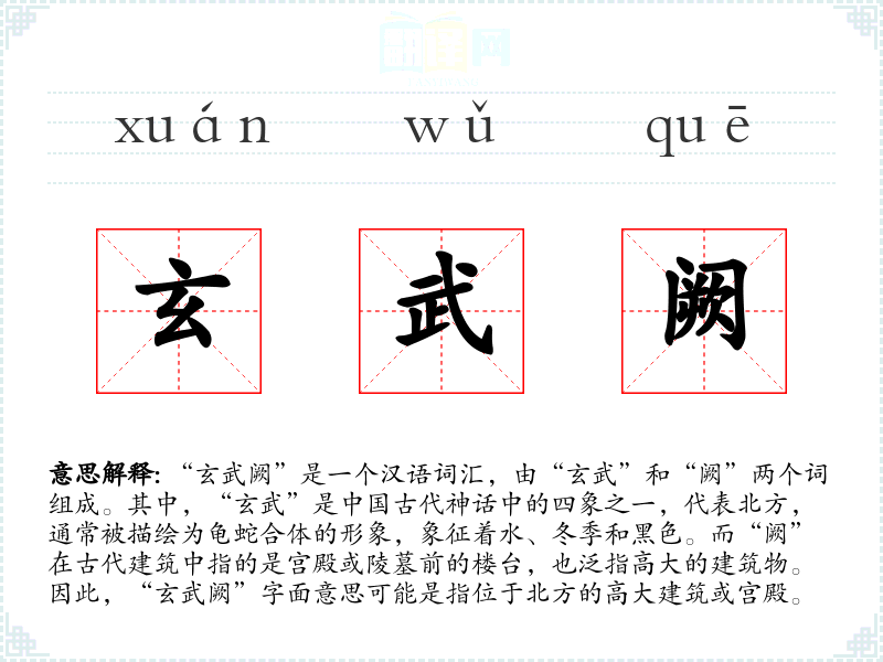 “玄武”源自**古代的四象(青龙、白虎、朱雀、玄武),而“阙”则源自古代建筑的名称。随着时间的推移,“玄武阙”这个词汇可能更多地出现在文学和历史记载中,成为描述古代建筑和神话场景的专用词汇。