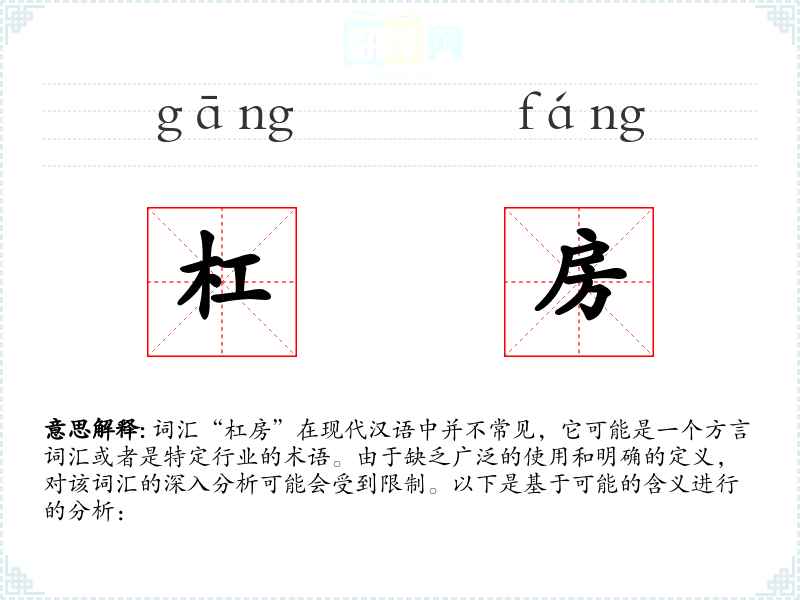 “杠房”作为一个不太常见的词汇,其分析受到限制。在语言学习和表达中,了解这样的词汇可以帮助我们更好地理解特定地区或行业的文化特色。