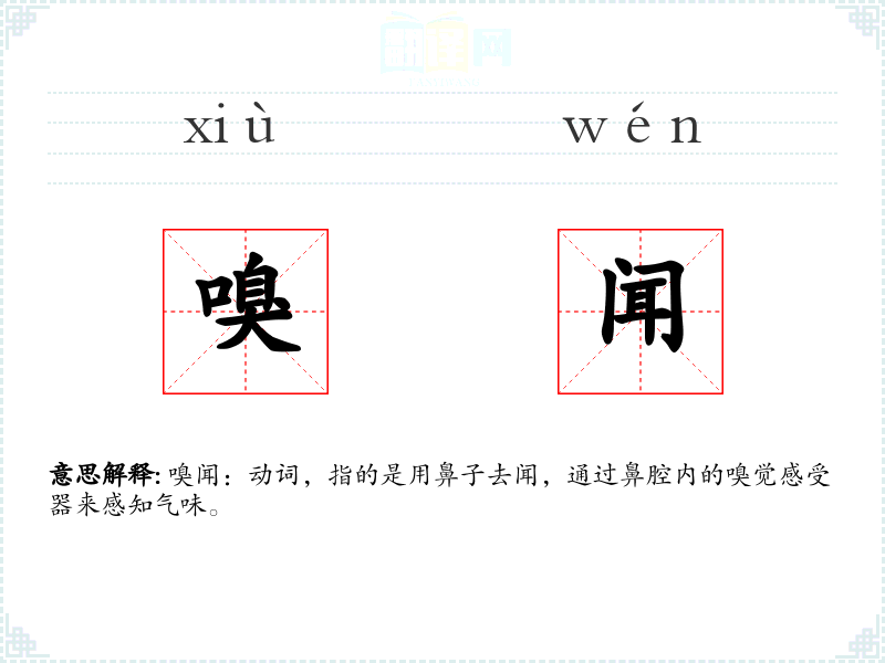 - 反义词:无(因为“嗅闻”是一个具体的动作,没有直接的反义词)