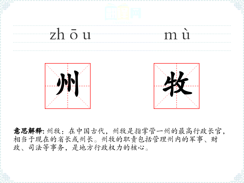 州牧:在**古代,州牧是指掌管一州的最高行政长官,相当于现在的省长或州长。州牧的职责包括管理州内的军事、财政、司法等事务,是地方行政权力的核心。