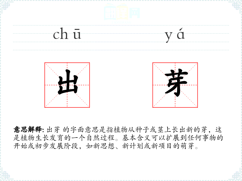 出芽 的字面意思是指植物从种子或茎上长出新的芽,这是植物生长发育的一个自然过程。基本含义可以扩展到任何事物的开始或初步发展阶段,如新思想、新计划或新项目的萌芽。