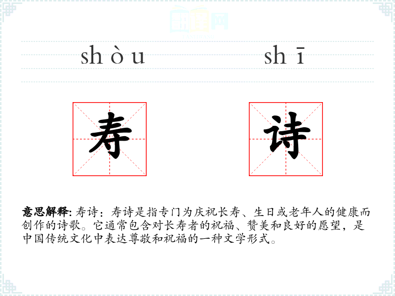 文学:在古典文学中,寿诗常常出现在贺寿文、寿联、寿宴等场合,用以表达对的敬意和祝福。 口语:在现代口语中,虽然直接创作寿诗的情况较少,但人们仍会用诗歌的形式来表达对长辈生日的祝福。 专业领域**:在文学研究和民俗学中,寿诗作为一种文化现象被研究,探讨其在社会交往和文化传承中的作用。