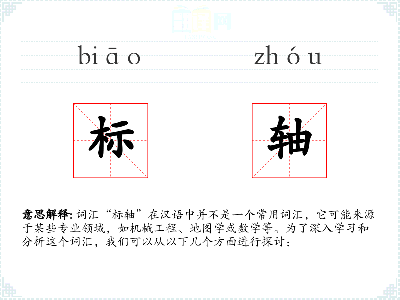 “标轴”这个词可能是由“标”(标记、刻度)和“轴”(轴线、中心线)两个字组合而成,用于描述带有标记的轴线。