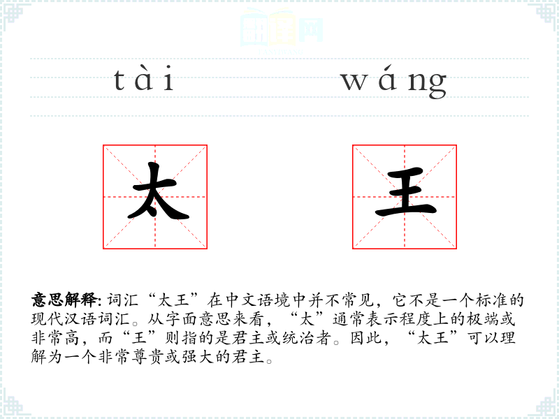 - 词源:这个词汇可能是由“太”和“王”两个字组合而成,其中“太”源自古代汉语,表示极端或最高,而“王”则是指君主。