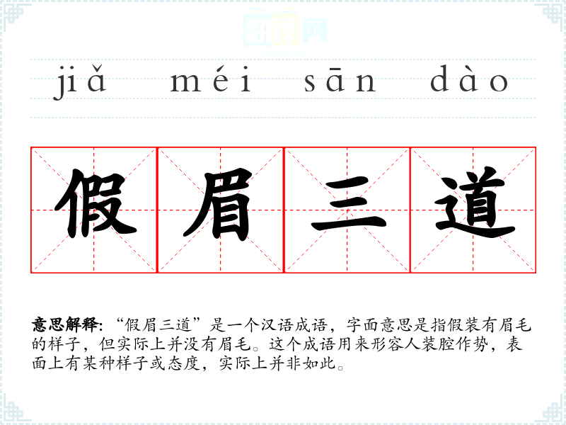“假眉三道”是一个汉语成语,字面意思是指假装有眉毛的样子,但实际上并没有眉毛。这个成语用来形容人装腔作势,表面上有某种样子或态度,实际上并非如此。