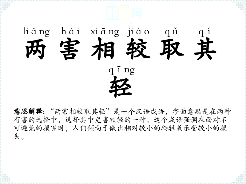 “两害相较取其轻”是一个充满智慧的成语,它不仅在语言表达中提供了简洁的决策原则,也在文化和哲学层面提供了深刻的思考。在个人语言学*和表达中,理解和运用这个成语可以增强决策的理性和智慧。