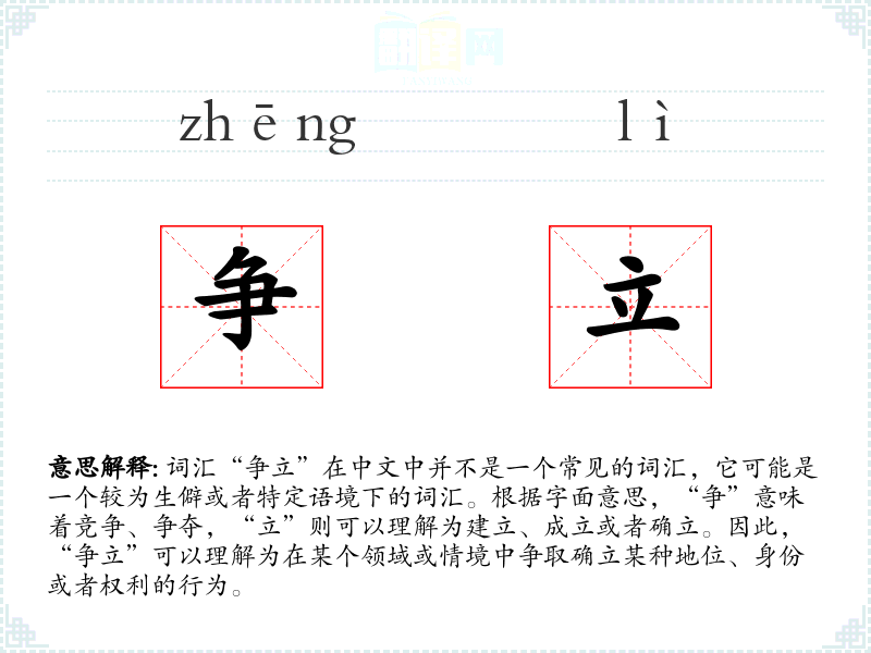 词汇“争立”在中文中并不是一个常见的词汇,它可能是一个较为生僻或者特定语境下的词汇。根据字面意思,“争”意味着竞争、争夺,“立”则可以理解为建立、成立或者确立。因此,“争立”可以理解为在某个领域或情境中争取确立某种地位、身份或者权利的行为。