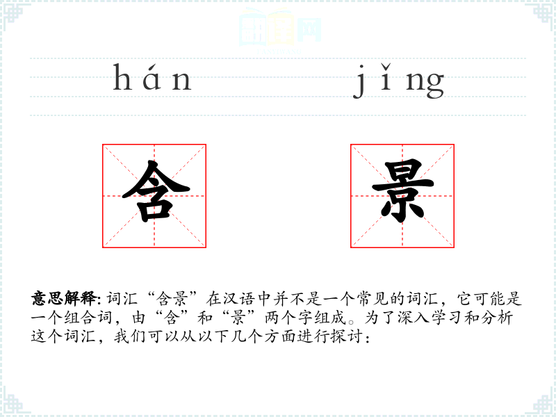 词汇“含景”在汉语中并不是一个常见的词汇,它可能是一个组合词,由“含”和“景”两个字组成。为了深入学*和分析这个词汇,我们可以从以下几个方面进行探讨: