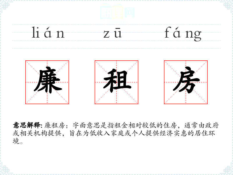 - 词源:廉租房一词源于对“廉价”和“住房”的组合,强调其经济实惠的特点。
