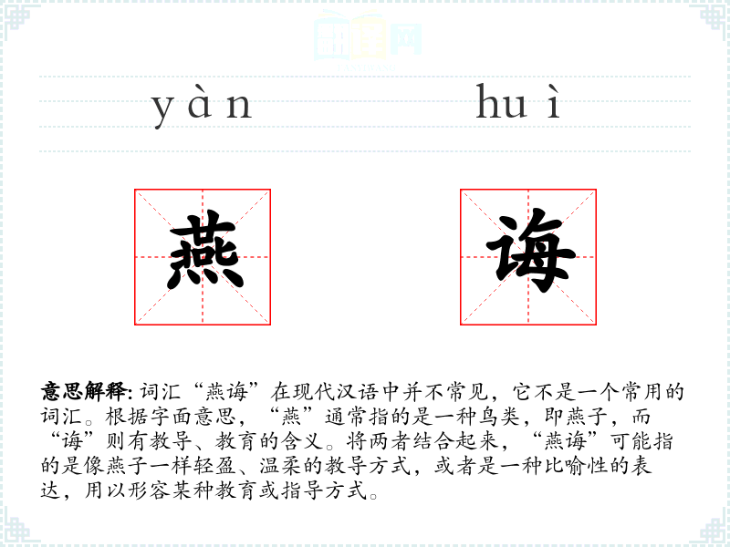 由于“燕诲”不是一个常用词汇,其词源和历史演变不详。它可能是由“燕”和“诲”两个字组合而成的一个比喻性词汇。