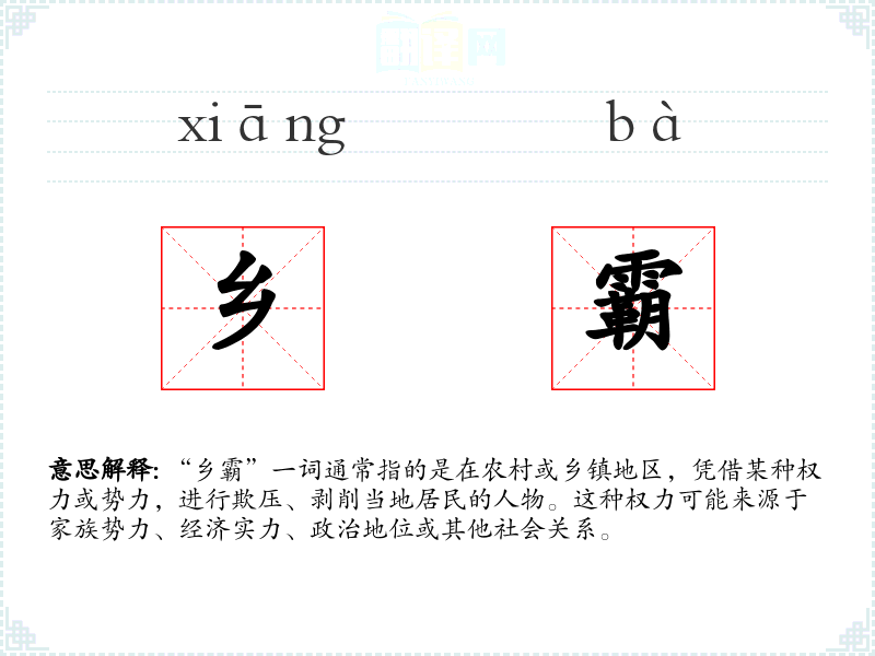 “乡霸”一词通常指的是在农村或乡镇地区,凭借某种权力或势力,进行欺压、剥削当地居民的人物。这种权力可能来源于家族势力、经济实力、政治地位或其他社会关系。