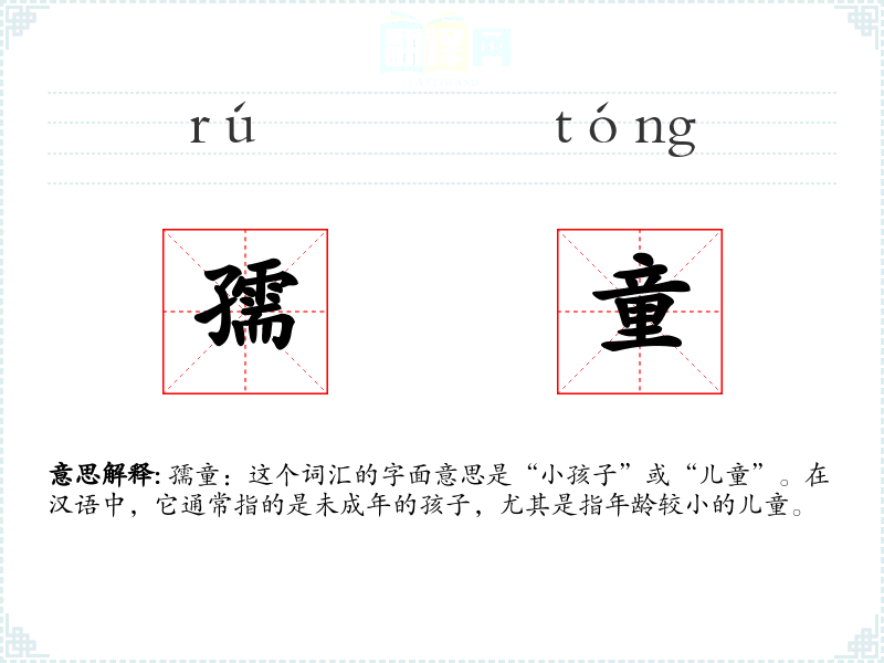 “孺童”一词源于古代汉语,其中“孺”字意为幼小,“童”字意为儿童。在古代文献中,如《诗经》、《左传》等,已有使用“孺”字来指代儿童的例子。随着时间的推移,“孺童”逐渐成为指代小孩子的一个固定词汇。