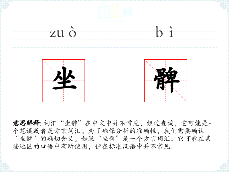 词汇“坐髀”在中文中并不常见,经过查询,它可能是一个笔误或者是方言词汇。为了确保分析的准确性,我们需要确认“坐髀”的确切含义。如果“坐髀”是一个方言词汇,它可能在某些地区的口语中有所使用,但在标准汉语中并不常见。