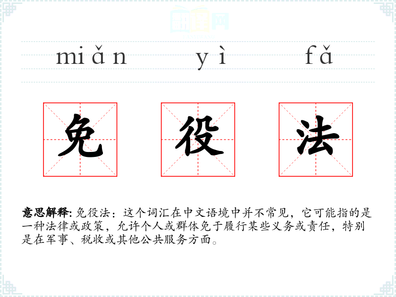 免役法:这个词汇在中文语境中并不常见,它可能指的是一种法律或政策,允许个人或群体免于履行某些义务或责任,特别是在军事、税收或其他公共服务方面。