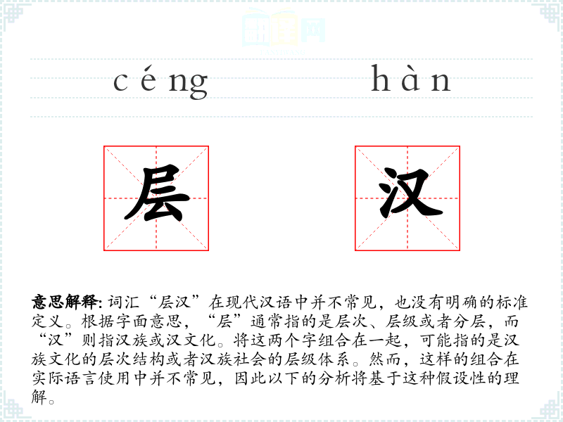 词汇“层汉”在现代汉语中并不常见,也没有明确的标准定义。根据字面意思,“层”通常指的是层次、层级或者分层,而“汉”则指或汉文化。将这两个字组合在一起,可能指的是文化的层次结构或者**社会的层级体系。然而,这样的组合在实际语言使用中并不常见,因此以下的分析将基于这种假设性的理解。