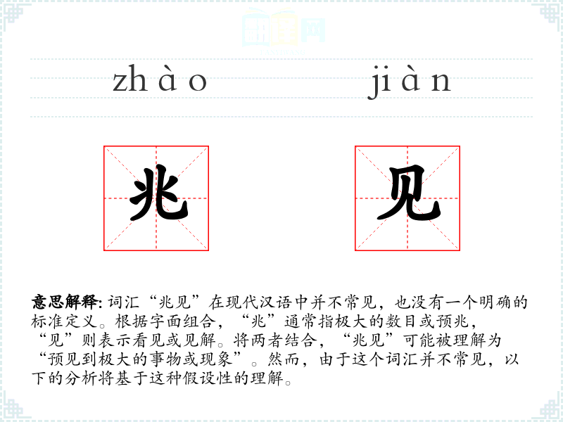 词汇“兆见”在现代汉语中并不常见,也没有一个明确的标准定义。根据字面组合,“兆”通常指极大的数目或预兆,“见”则表示看见或见解。将两者结合,“兆见”可能被理解为“预见到极大的事物或现象”。然而,由于这个词汇并不常见,以下的分析将基于这种假设性的理解。