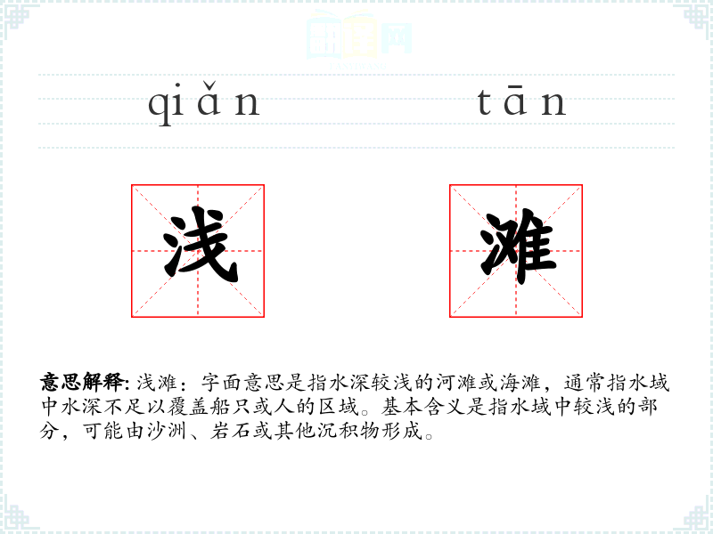 浅滩:字面意思是指水深较浅的河滩或海滩,通常指水域中水深不足以覆盖船只或人的区域。基本含义是指水域中较浅的部分,可能由沙洲、岩石或其他沉积物形成。