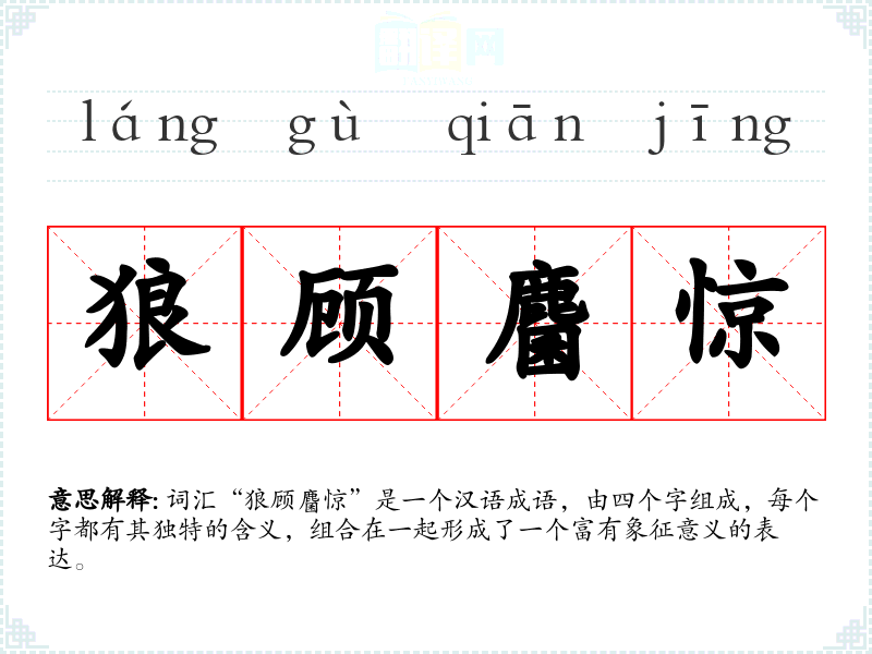 词汇“狼顾麕惊”是一个汉语成语,由四个字组成,每个字都有其独特的含义,组合在一起形成了一个富有象征意义的表达。