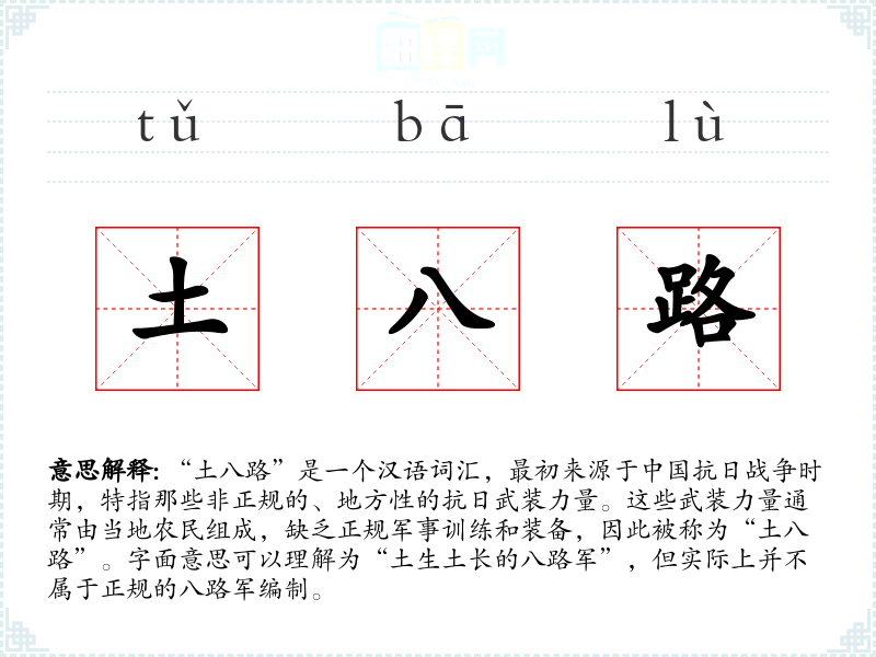 “土八路”是一个汉语词汇,最初来源于**抗日战争时期,特指那些非正规的、地方性的抗日武装力量。这些武装力量通常由当地农民组成,缺乏正规军事训练和装备,因此被称为“土八路”。字面意思可以理解为“土生土长的八路军”,但实际上并不属于正规的八路军编制。
