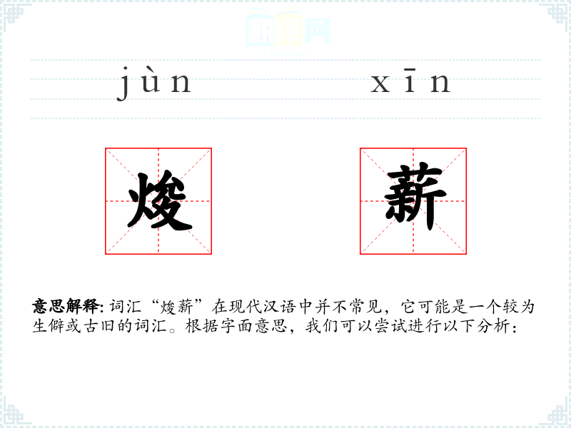 词汇“焌薪”在现代汉语中并不常见,它可能是一个较为生僻或古旧的词汇。根据字面意思,我们可以尝试进行以下分析: