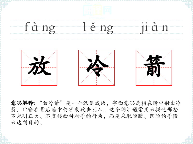 “放冷箭”是一个汉语成语,字面意思是指在暗中射出冷箭,比喻在背后暗中伤害或攻击别人。这个词汇通常用来描述那些不光明正大、不直接面对对手的行为,而是采取隐蔽、阴险的手段来达到目的。