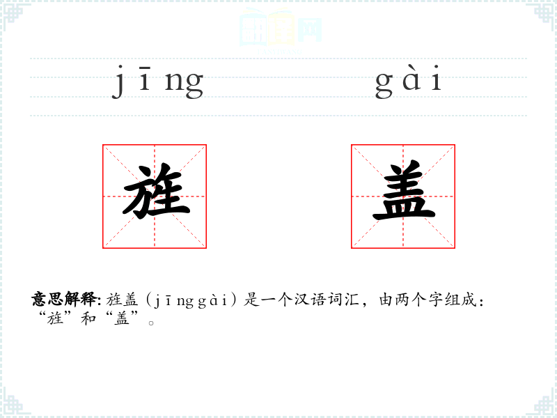 旌盖(jīng gài)是一个汉语词汇,由两个字组成:“旌”和“盖”。