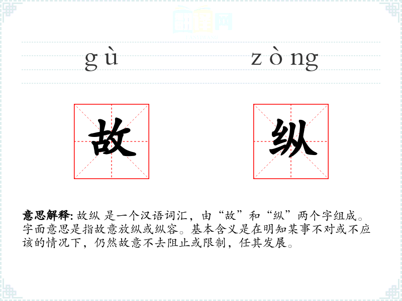 故纵 是一个汉语词汇,由“故”和“纵”两个字组成。字面意思是指故意放纵或纵容。基本含义是在明知某事不对或不应该的情况下,仍然故意不去阻止或限制,任其发展。
