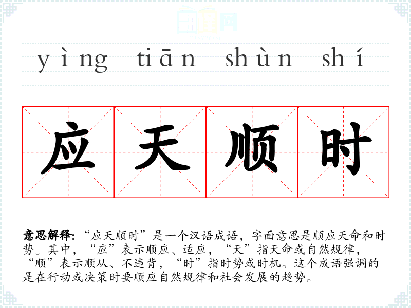 “应天顺时”是一个汉语成语,字面意思是顺应天命和时势。其中,“应”表示顺应、适应,“天”指天命或自然规律,“顺”表示顺从、不违背,“时”指时势或时机。这个成语强调的是在行动或决策时要顺应自然规律和社会发展的趋势。