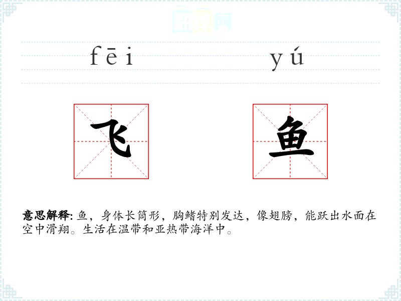 鱼,身体长筒形,胸鳍特别发达,像翅膀,能跃出水面在空中滑翔。生活在温带和亚热带海洋中。
