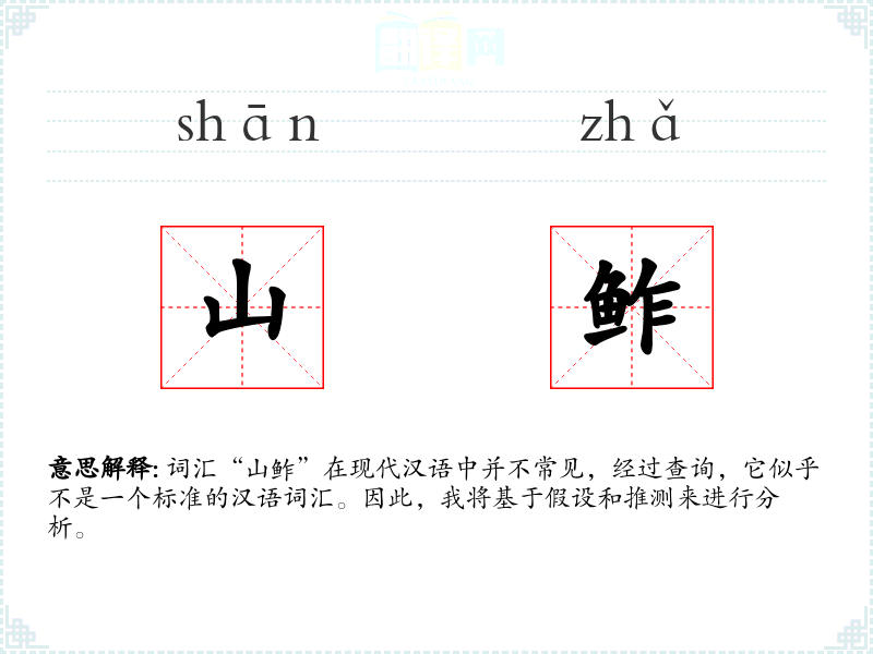 由于“山鲊”不是一个标准词汇,我们无法给出确切的字面意思和基本含义。但从字面上看,“山”通常指山脉或高地,“鲊”在古代汉语中可能指一种鱼类或鱼制品。因此,我们可以推测“山鲊”可能指的是某种生活在山区的鱼类或与山区有关的鱼制品。