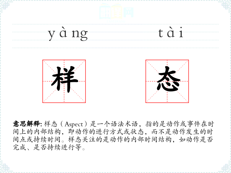 样态(Aspect)是一个语法术语,指的是动作或**在时间上的内部结构,即动作的进行方式或状态,而不是动作发生的时间点或持续时间。样态关注的是动作的内部时间结构,如动作是否完成、是否持续进行等。