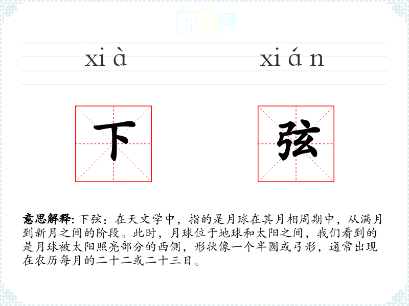 - 专业领域:在天文学或历法研究中,下弦是一个精确的术语,用于描述月相的特定阶段。