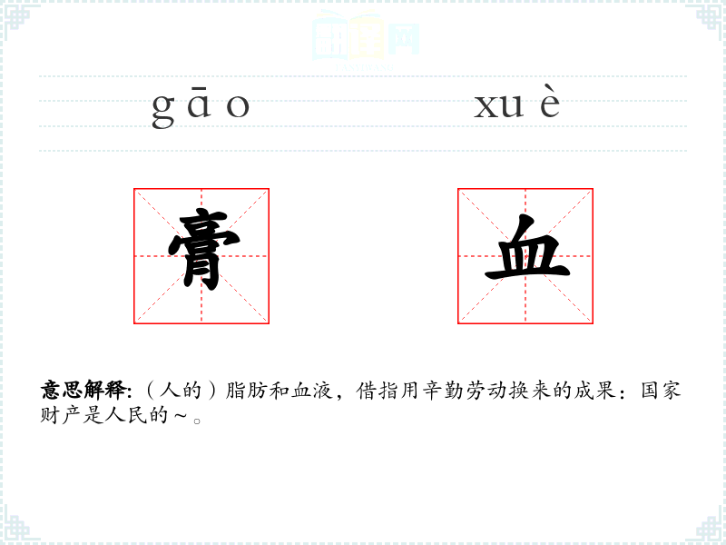 (人的)脂肪和血液,借指用辛勤劳动换来的成果:国家财产是人民的~。