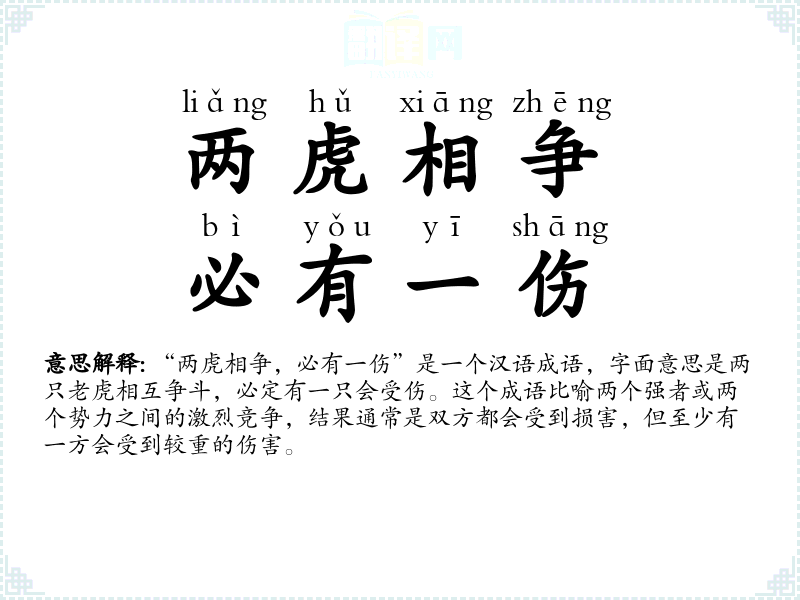 “两虎相争,必有一伤”是一个汉语成语,字面意思是两只**相互争斗,必定有一只会受伤。这个成语比喻两个强者或两个势力之间的激烈竞争,结果通常是双方都会受到损害,但至少有一方会受到较重的伤害。
