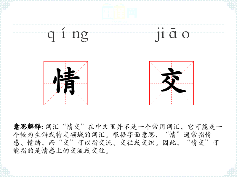 词汇“情交”在中文里并不是一个常用词汇,它可能是一个较为生僻或特定领域的词汇。根据字面意思,“情”通常指情感、情绪,而“交”可以指交流、交往或交织。因此,“情交”可能指的是情感上的交流或交往。