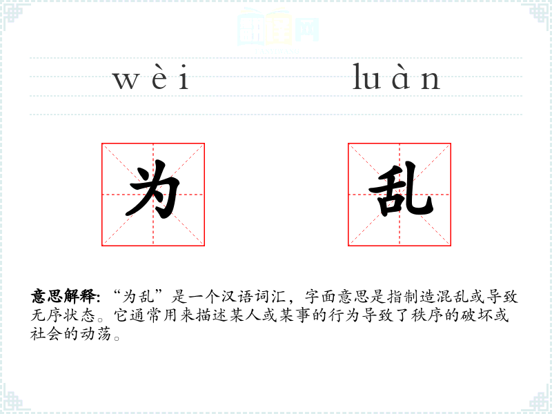 “为乱”是一个汉语词汇,字面意思是指制造混乱或导致无序状态。它通常用来描述某人或某事的行为导致了秩序的破坏或社会的动荡。