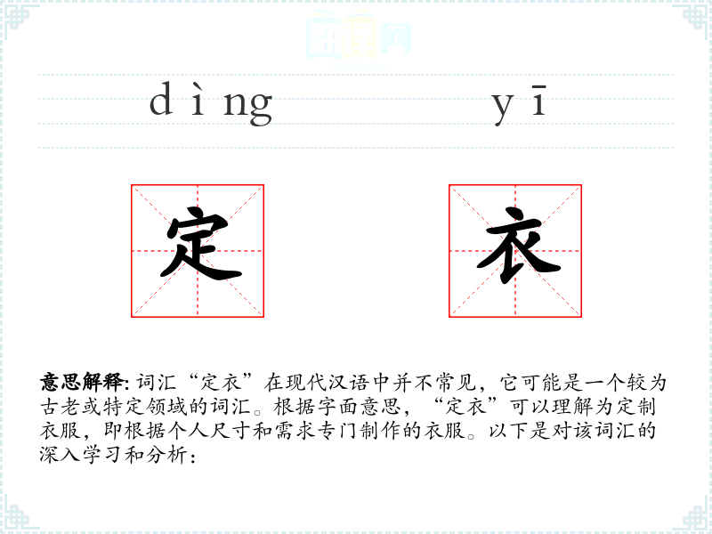 词汇“定衣”在现代汉语中并不常见,它可能是一个较为古老或特定领域的词汇。根据字面意思,“定衣”可以理解为定制衣服,即根据个人尺寸和需求专门制作的衣服。以下是对该词汇的深入学习和分析: