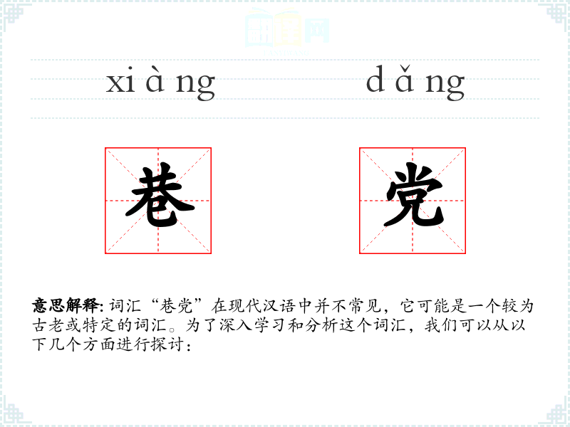 词汇“巷党”在现代汉语中并不常见,它可能是一个较为古老或特定的词汇。为了深入学*和分析这个词汇,我们可以从以下几个方面进行探讨: